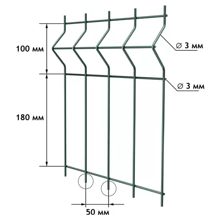 Особенность заборов с секциями из 3D-панелей — V-образный изгиб полотна, который формирует ребро жесткости. В результате стойкость конструкции к механическим нагрузкам (вибрационным, ударным или любым другим) значительно повышается при незначительном повышении веса секции. Благодаря многослойному антикоррозийному покрытию такой забор для производства прослужит 60 лет.